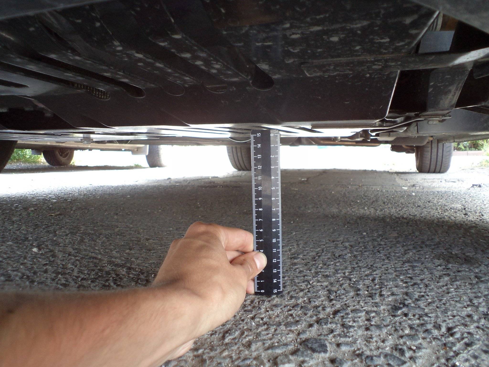 На обычных легковых автомобилях с клиренсом не более 18 сантиметров самая низкая точка кузова чаще всего располагается спереди — в таком случае расстояние от земли до нижней кромки переднего бампера и будет отражать интересующий нас параметр. Для проведения замеров можно использовать рулетку или обычную линейку.